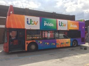 The Leeds Pride parade featured an open-top double-decker bus wrapped for the occasion by the team behind Emmerdale‘s on-screen graphics