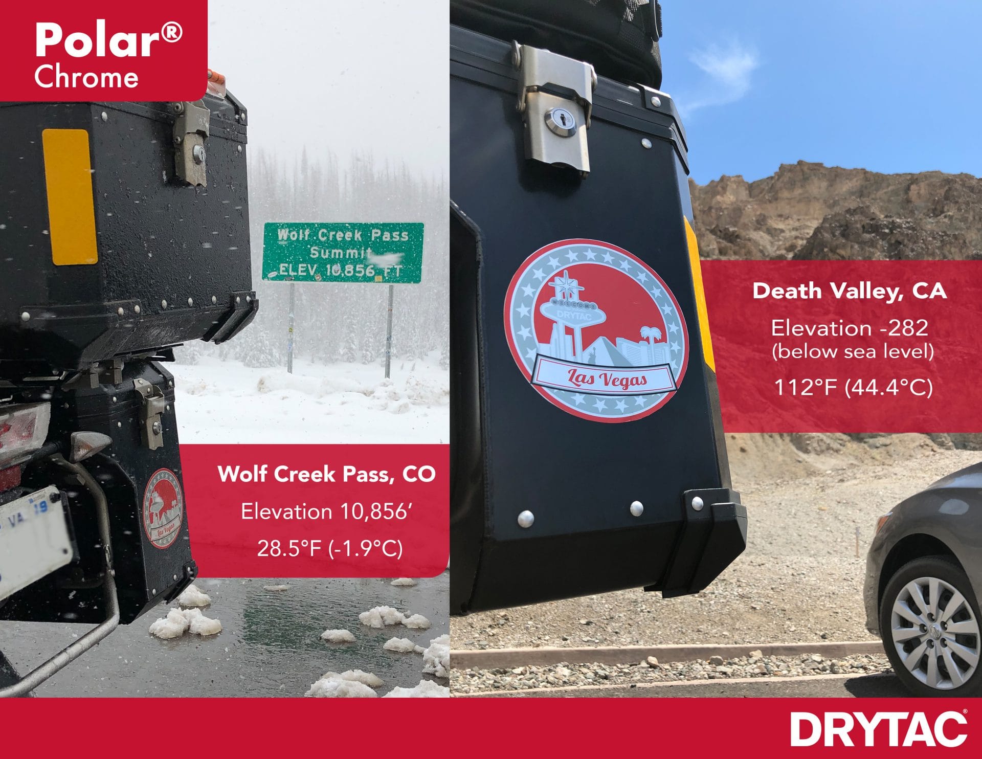The 2,400 mile, 36-hour ride to Las Vegas (and back again) presented a great opportunity to test out Polar Chrome, Drytac’s bold new reflective film designed foreye-catching indoor and short-term outdoor signage, billboards and exhibition graphics, POS displays, bus and subway advertisements, and ultra-reflective labels and decals. Tests have shown Polar Chrome offers exterior durability of up to two years, and Jerry’s extreme motorcycle ride proves it can withstand even the toughest conditions.