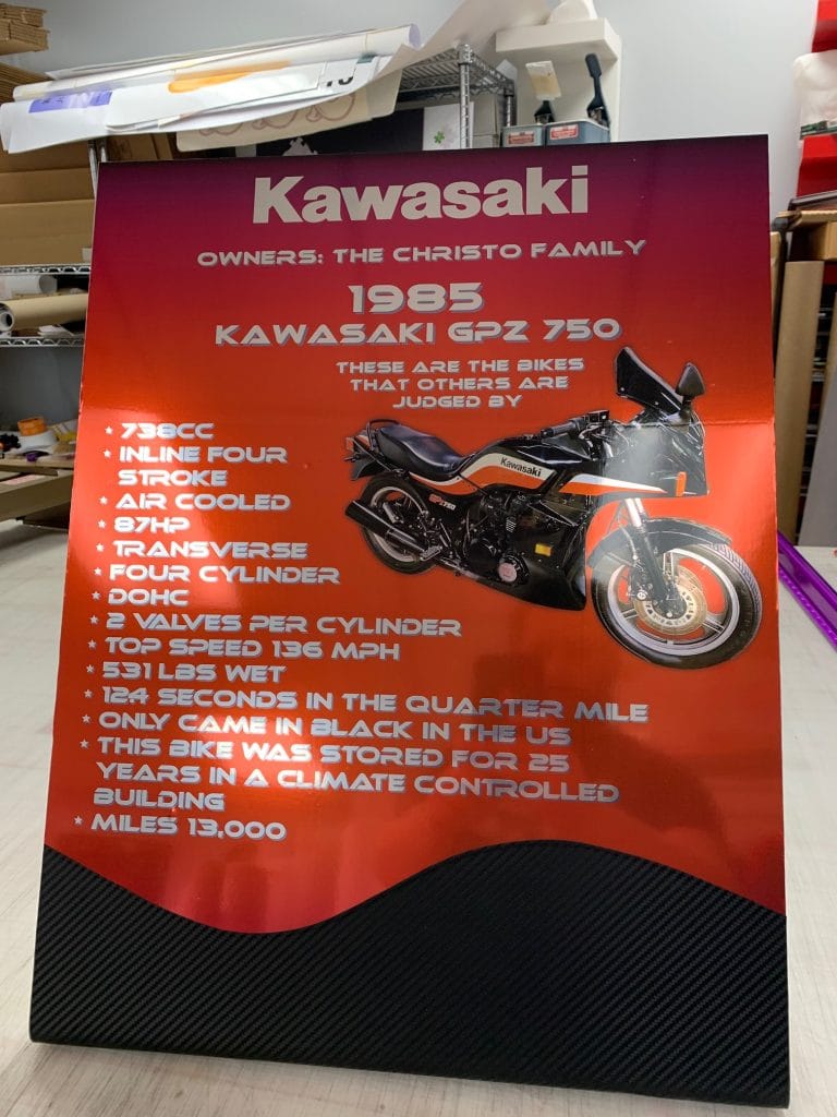 A local customer planned to submit three restored motorcycles to the show together with displays listing their key information. The signs were based on an existing one from a previous event at which it had exhibited a car. HugePrints decided to print the motorcycle signs slightly smaller, since the bikes themselves were on a smaller scale than the car, but still wanted them to stand out and draw attention.