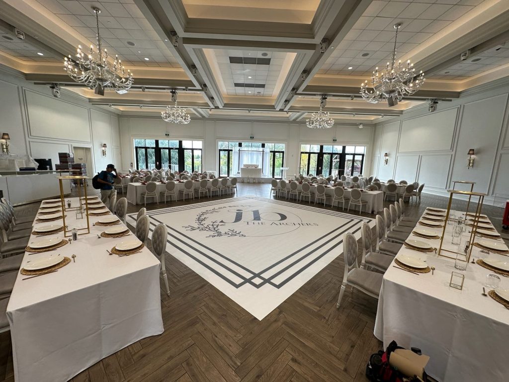 The application measured 20ft x 20ft and featured a black and white design, complete with the first initials of the bride and groom, along with their now-family name, the Archers. Other aspects of the design included a lined border around the edge of the dancefloor and a large graphic in the centre.