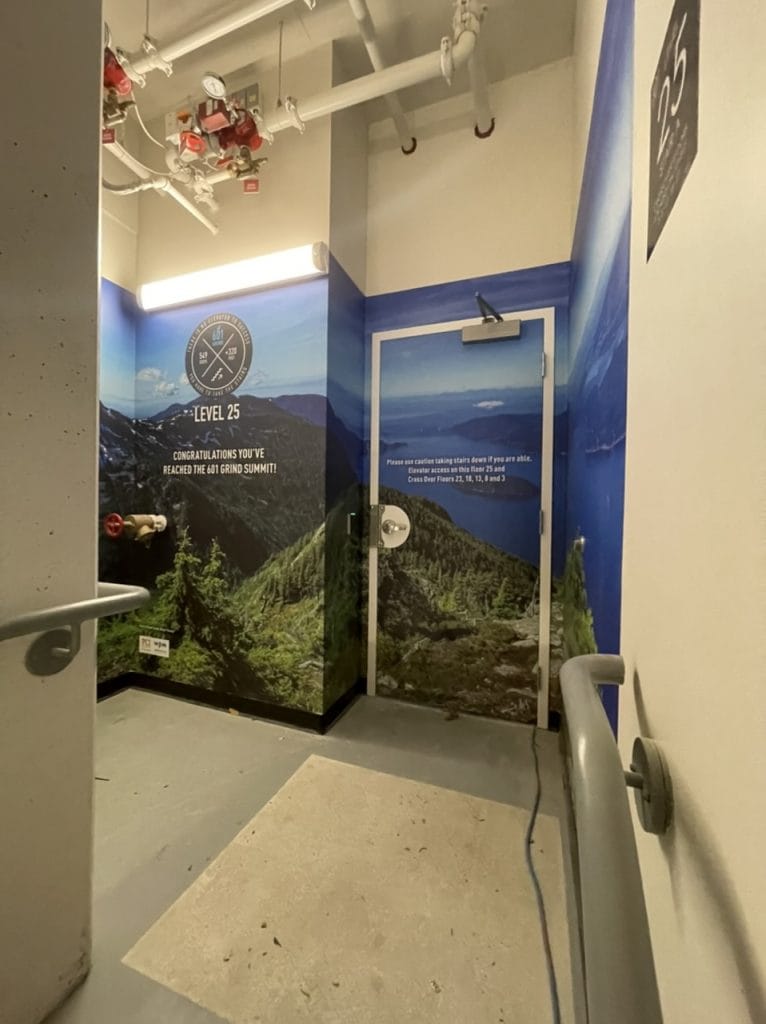 The building in question, 601 West Hastings, reaches up 26 stories into the British Columbia sky. Premier Graphics were handed the task of bringing a fresh feel to the otherwise-dull stairwells that people use to travel up and down the tower.
