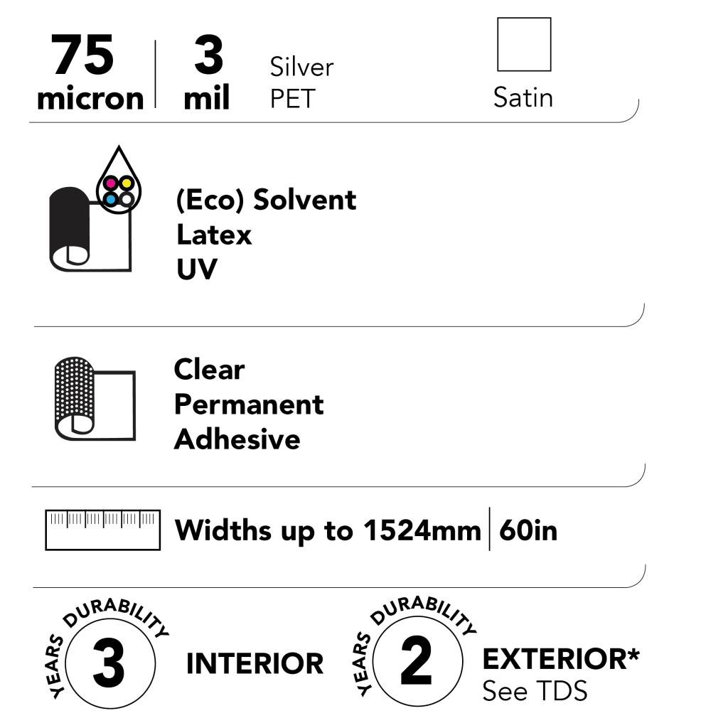 Polar Chrome is a 75 micron (3 mil) reflective satin silver PET film that catches the light for a stunning finish. Thanks to its compatibility with eco-solvent, solvent, latex and UV printing technology and availability in rolls up to 60″ wide, it is ideal for a wide variety of applications such as billboards, exhibition graphics, POS displays and public transport advertisements.
