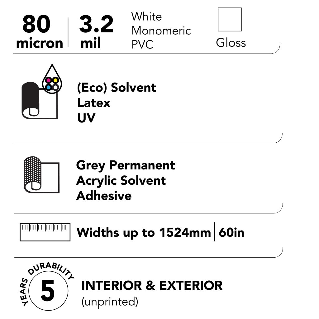 Polar Choice Air White Gloss PB is an 80μ (3.2 mil) gloss white monomeric PVC film, coated on one side with a permanent, pressure sensitive grey solvent acrylic adhesive that is protected by a 140gsm embossed white 2 side PE coated release liner with bubble free technology. Suitable for interior and exterior use (up to 5 years).