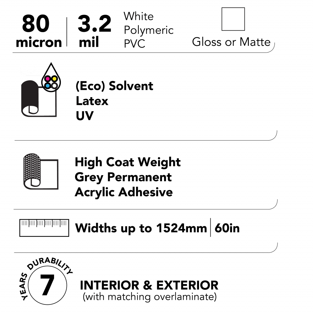Polar Grip polymeric self-adhesive PVC film is the ideal solution when your digitally printed signs or graphics need to be there to stay, whatever the conditions, for up to seven years with a matching laminate. The high bond adhesive of Polar Grip means you can permanently apply graphics to any surface, such as metal, plastic, wood, glass, brick and more using a premium vinyl with performance you can trust.