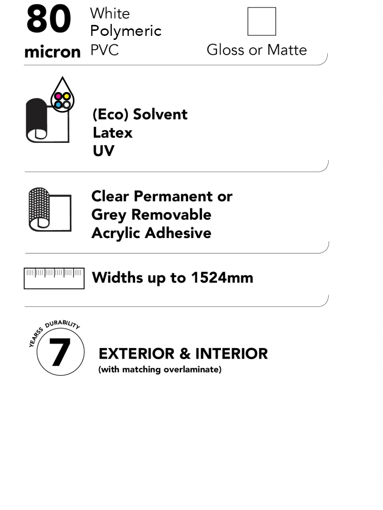 “Polar Premium 80 is a great all-rounder with a consistent white point for a broad range of printable vinyl graphics.  It is ideal for general signage, window graphics, exhibition graphics and POS displays. It can also be used for vehicle livery on flat or slightly curved surfaces.”