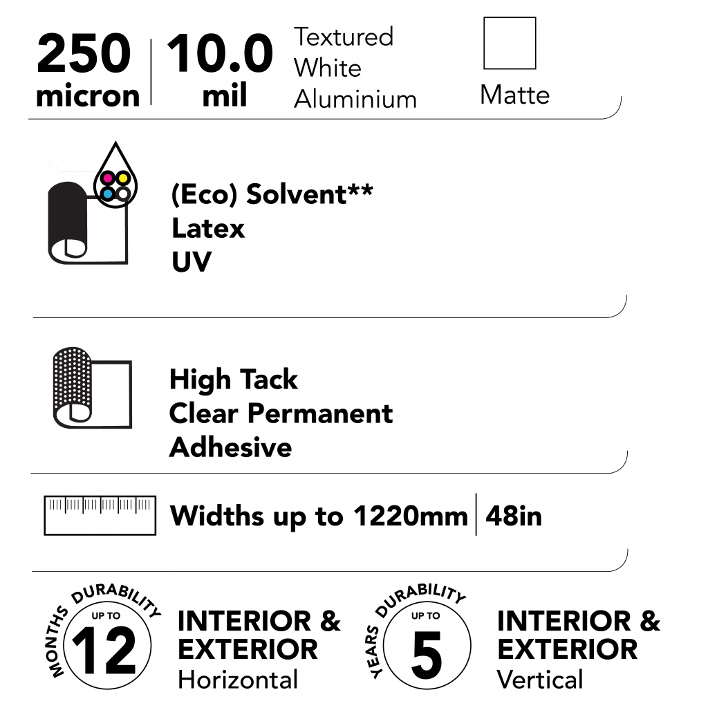Polar Street FX is a 250µ (10 mil) textured printable white matte aluminium film, coated on one side with a clear, high tack adhesive. The textured ink receptive film will produce high quality graphics resistant to scuffing and high traffic. Polar Street FX has achieved several slip ratings and certifications, making it ideal for public environments.