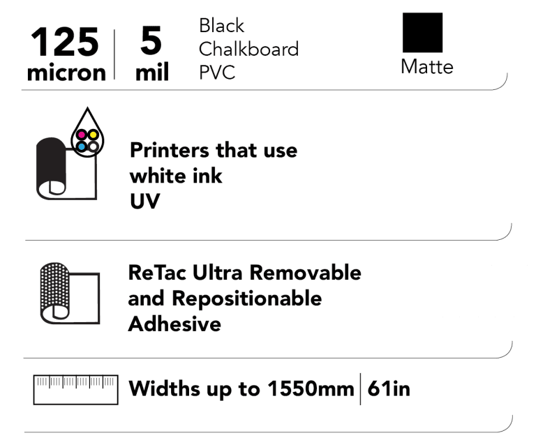 ReTac ChalkMate offers a traditional chalkboard finish that can be used with both standard chalk and liquid chalk markers.  It can be cut into custom shapes and designs to create a unique portable chalkboard to meet almost any requirement. The self-adhesive chalkboard finish printable PVC film is ideal for teaching environments, restaurants and bars, office and home use, promotional applications and more,