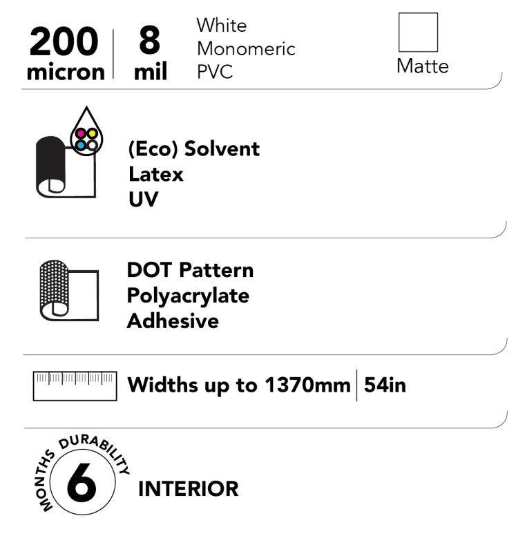 SpotOn Floor 200 is a 200μ (8 mil) embossed printable white matte monomeric PVC film, coated on one side with a dot pattern, removable pressure sensitive polyacrylate adhesive. The adhesive is protected by a single sided, siliconised clay coated kraft release liner. This high quality ink receptive embossed white vinyl was specifically developed for easy application.