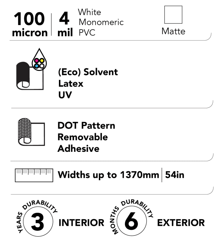 Suitable for short-term indoor graphics applications, SpotOn White M50 is a 100µ (4 mil) high quality, ink receptive printable vinyl. SpotOn monomeric has been developed specifically for the creation of vibrant graphics requiring quick and easy application and removal.  No special tools are required when applying the vinyl, not even a squeegee.