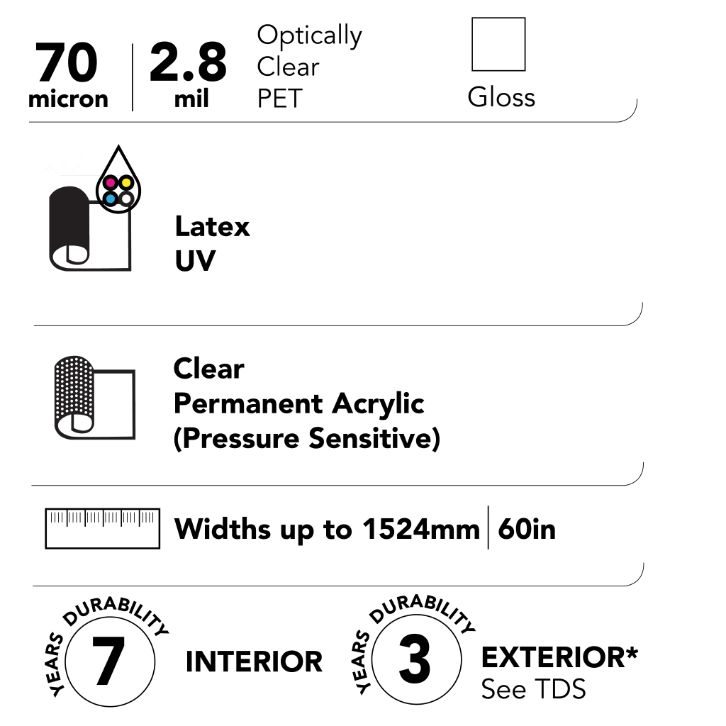 This optically clear printable window film utilises a special ink-receptive top coat for greater adhesion of inks. ViziPrint Deco + is ideal for architectural applications where decorative glass details are needed to create dynamic spaces, including conference rooms or private meeting areas. It can also be used to create graphics and window decals for retail storefronts and POP or backlit displays.