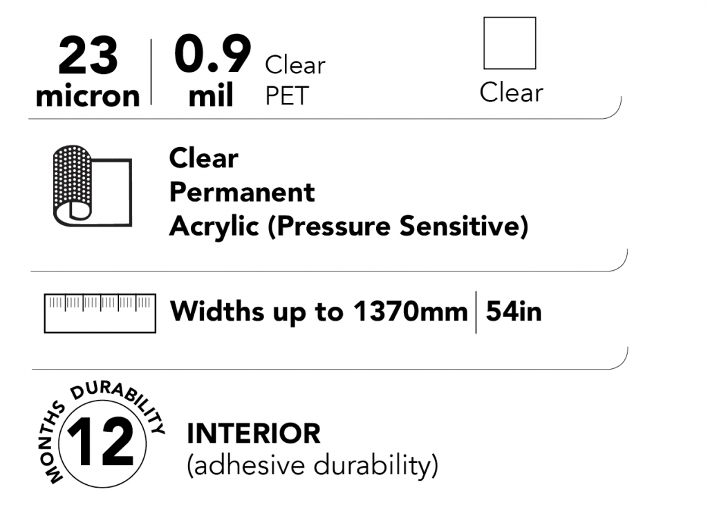 WindowTac is a 0.9 mil (23μ) visually clear PET film, coated on one side with a pressure sensitive, removable adhesive that is protected by a micro-grooved PE release liner that imparts an embossed pattern onto the adhesive coating. The other side is coated with a pressure sensitive, aggressive permanent adhesive that is protected by a bleached Kraft release paper coated on both sides with PE and siliconised on the release side. The film contains UV stabilisers, which protect against UV degradation, and the micro-grooves in its adhesive allow for easy air evacuation.